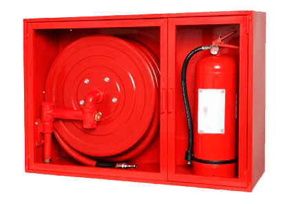 - Boca de Incendio equipada Ø45mm: Su principal característica es que su manguera es flexible y plana (adopta forma cilíndrica cuando está sometida a presión), lo que hace necesario su total extensión antes de abrir la válvula de paso de agua.