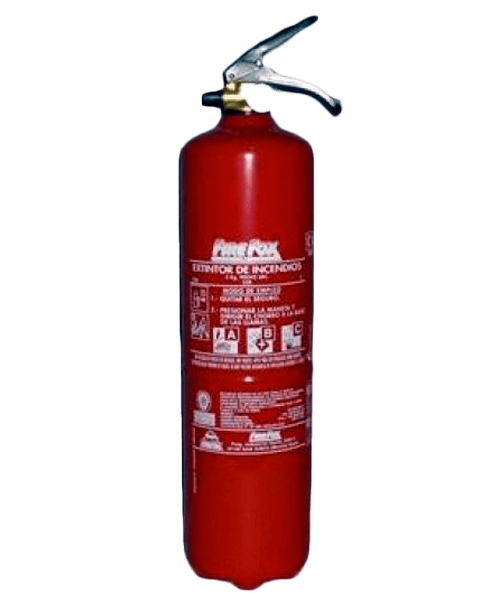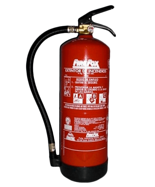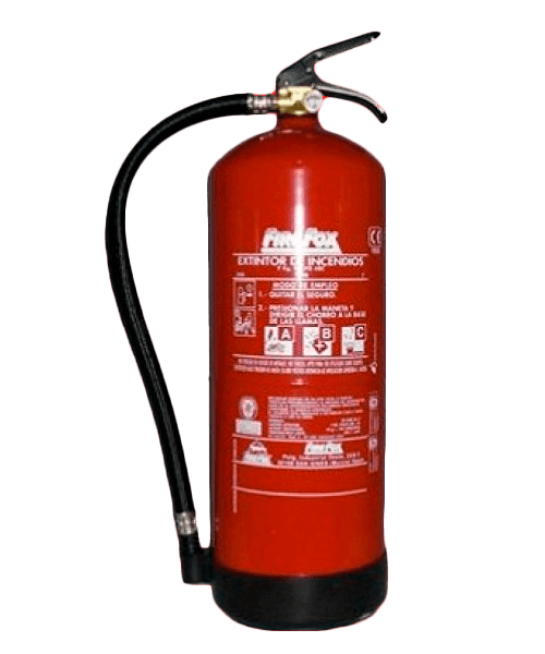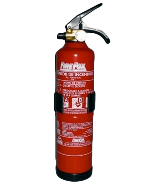 Extintores de polvo ABC: Disponibles con cargas de; 1 Kg, 3 Kg, 6 Kg, 9 Kg, 25 Kg (carro) y 50 Kg (carro).